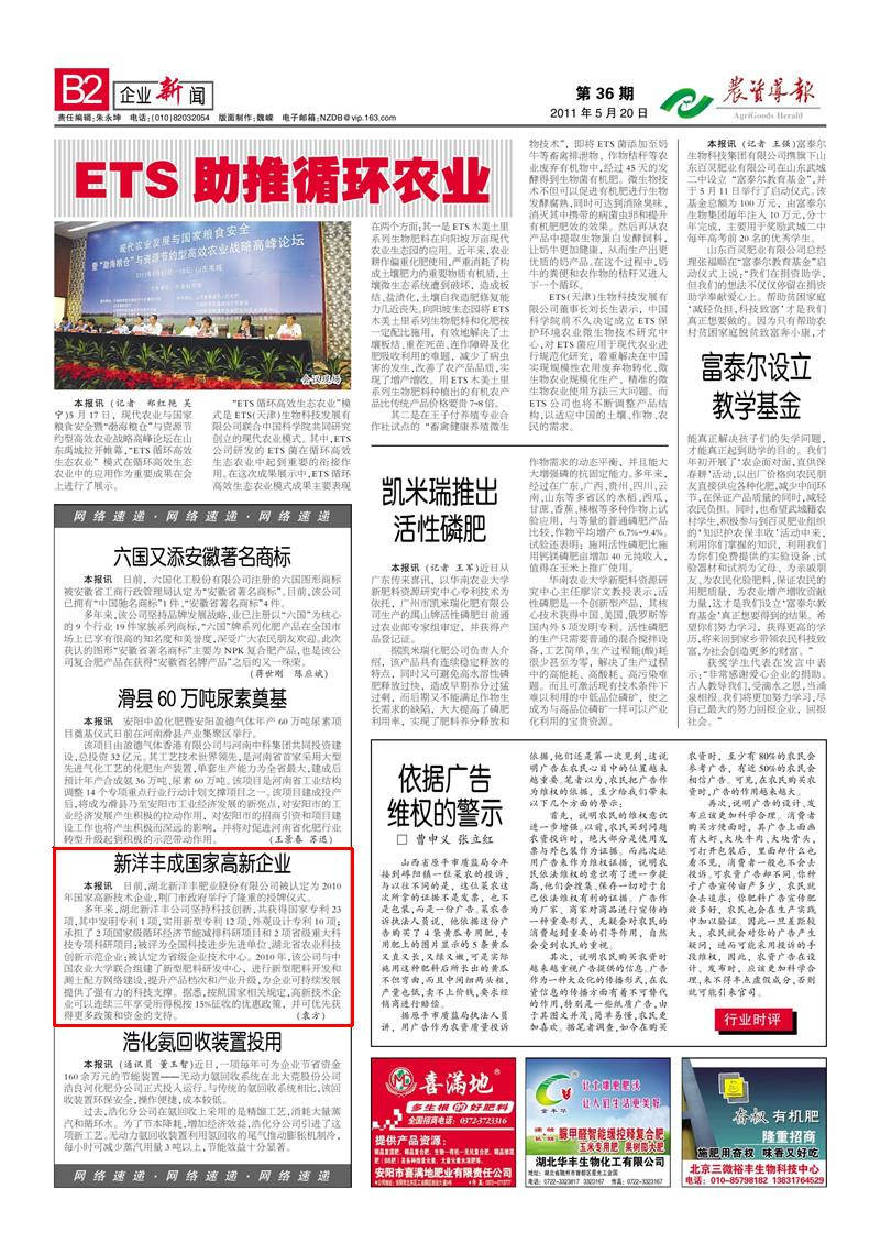多年来,湖北乐鱼体育公司坚持科技创新,共获得国家专利23项,其中发明专利 1 项,实用新型专利12项,外观设计专利10项;承担了2项国家级循环经济节能减排科研项目和2项省级重大科技专项科研项目;被评为全国科技进步先进单位、湖北省农业科技创新示范企业;被认定为省级企业技术中心。2010年,该公司与中国农业大学联合组建了新型肥料研发中心,进行新型肥料开发和测土配方网络建设,提升产品档次和产业升级,为企业可持续发展提供了强有力的科技支撑。据悉,按照国家相关规定,高新技术企业可以连续三年享受所得税按15%征收的优惠政策,并可优先获得更多政策和资金的支持。