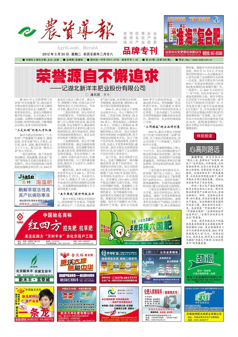 三是在企业整体形象宣传上大手笔。该公司利用会议、报刊、促销品、墙体广告等各种载体进行全方位立体宣传的同时,连续多年在央视《天气预报》、《沃野天机》栏目刊播广告,树立高端的品牌形象,提振洋丰的知名度和美誉度。2011年11月8日,中央电视台招标现场--北京梅地亚中心首次出现了全国肥料行业的第一位宾客,乐鱼体育肥业参与央视2012 广告黄金资源招标,目标直指《黄金剧场》电视剧中插广告,一投即中,以3600万元的价位“一举”中标。而在央视 2012 广告黄金资源招标之前,乐鱼体育肥业已分别签下中央电视台第一套节目《天气预报》栏目景观广告、中央电视台第六套节目电影频道《白天套》广告、中央电视台第七套节目农业频道《沃野天机》栏目独家赞助等广告资源,这三项广告在中央电视台的出镜率每天高达10次。连同《黄金剧场》广告,乐鱼体育肥业今年将在中央电视台频频亮相。