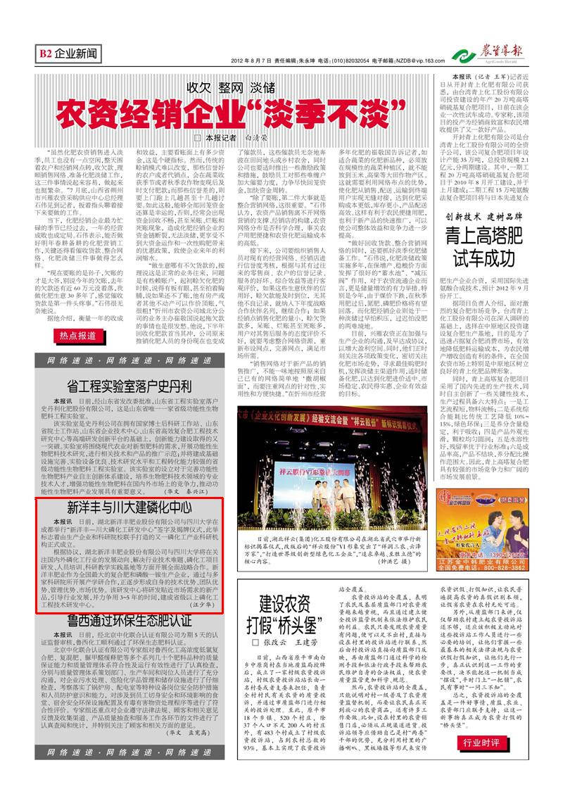 根据协议,湖北乐鱼体育肥业股份有限公司与四川大学将在关注国内外磷化工行业的发展动向、解决行业技术难题、磷化工项目研发、人员培训、科研教学实践基地等方面开展全面战略合作。乐鱼体育肥业作为全国最大的复合肥和磷酸一铵生产企业,通过与多家科研院所开展产学研合作,正逐步形成自身的技术优势、团队优势、管理优势、市场优势。该研发中心将研发贴近市场需求的新产品,引导行业发展,并力争用 3-5 年的时间,建成省级以上磷化工工程技术研发中心。