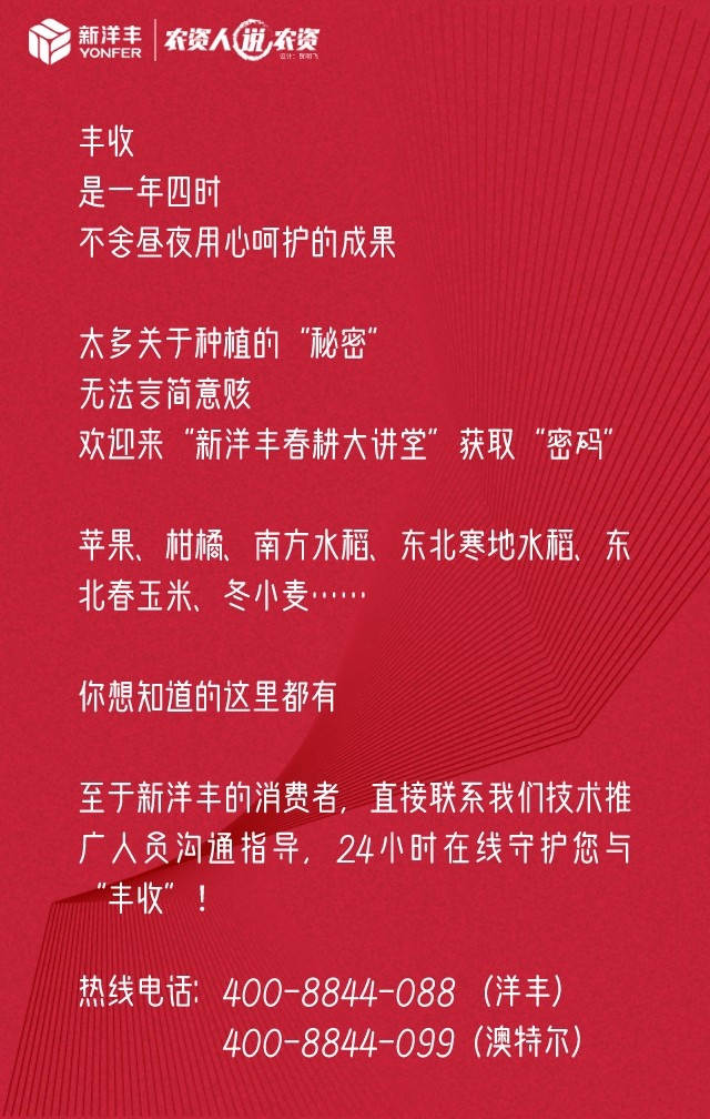 丰收,是一年四时、不舍昼夜用心呵护的成果。本期《农资人说农资》,让大咖带你破译丰收“密码”!苹果、柑橘、南方水稻、东北寒地水稻、东北春玉米、冬小麦……,你想知道的这里都有。太多关于种植的“秘密”,无法言简意赅,欢迎扫码回看“乐鱼体育绿色春耕大讲堂”,获取“成功种植”的“金钥匙”!