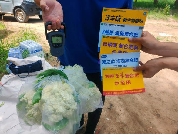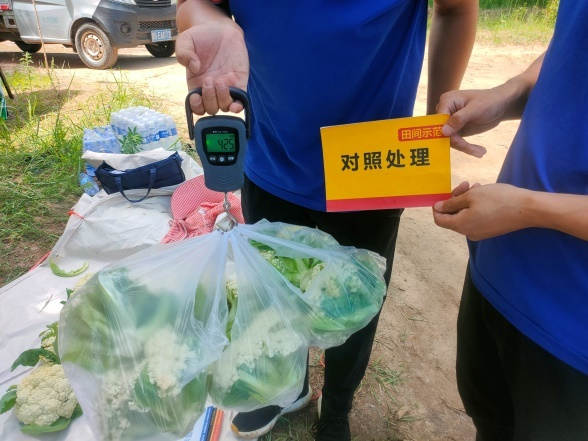 测产现场,参会农户随机从示范田和对照田分别摘取6颗白菜花进行称重,示范田白菜花平均每颗0.8公斤,对照田白菜花平均每颗0.7公斤,示范田较对照田每亩平均增产170公斤。